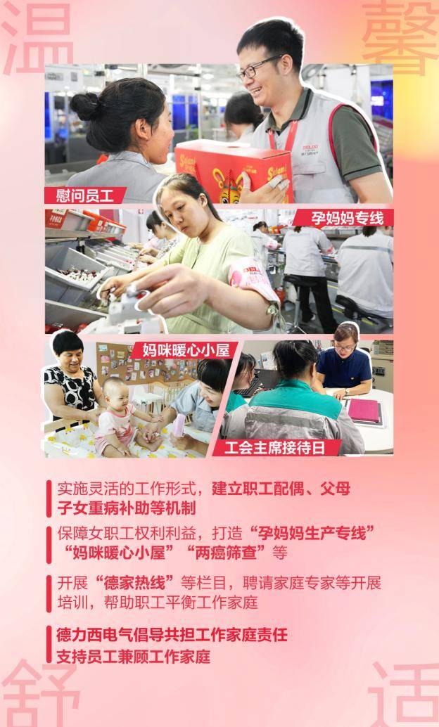 近日,中華全國總工會(huì)、人力資源社會(huì)保障部、國家衛(wèi)生健康委、中國企業(yè)聯(lián)合會(huì)中國企業(yè)家協(xié)會(huì)、中華全國工商業(yè)聯(lián)合會(huì)5家單位下發(fā)《關(guān)于建設(shè)家庭友好型工作場所案例征集結(jié)果的通報(bào)》。德力西電氣從近兩百案例中脫穎而出,入選首批“全國建設(shè)家庭友好型工作場所案例”。作為杰出雇主公司,德力西電氣堅(jiān)持以人為本,對員工有溫度,全方位優(yōu)化員工的生活方式,為員工提供有溫度、積極向上、和諧友愛的工作環(huán)境,打造了一個(gè)全方位的友好之“家”。 溫馨舒適,共享關(guān)懷 實(shí)現(xiàn)工作與家庭的和諧平衡向來是提升員工幸福感的重要保障。為提升德家人對工作與生活的滿足感,德力西電氣在倡導(dǎo)職工共擔(dān)工作家庭責(zé)任方面做出了諸多努力。德力西電氣開展“德家熱線”等欄目,同時(shí)聘請家庭方面的專家對職工進(jìn)行培訓(xùn)。在家庭幫助方面,德力西電氣還實(shí)施靈活的工作形式,同時(shí)建立職工配偶、父母、子女重病補(bǔ)助等機(jī)制,多方面考慮職工家庭需要。此外,德力西電氣也積極推進(jìn)各項(xiàng)呵護(hù)女性健康、服務(wù)女性需求的溫馨服務(wù),打造“孕媽媽生產(chǎn)專線”、“媽咪暖心小屋”、“兩癌篩查”等,全力保障女職工權(quán)利利益。