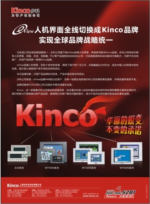 為實(shí)現(xiàn)公司全球品牌戰(zhàn)略統(tǒng)一,步科公司旗下的eView品牌人機(jī)界面,將逐漸切換為Kinco品牌。步科公司將成為擁有人機(jī)界面、伺服、步進(jìn)、變頻器、PLC等產(chǎn)品線的綜合自動(dòng)化公司,已經(jīng)具備提供自動(dòng)化解決方案能力,為便于在全球推廣,所有產(chǎn)品將統(tǒng)一使用Kinco品牌。