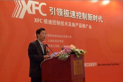 圖片注釋: 倍福中國區(qū)董事總經(jīng)理梁力強先生發(fā)表致辭并向觀眾介紹了XFC極速控制技術。
