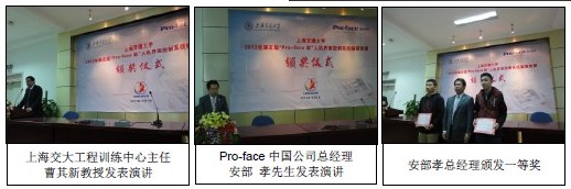 上海交通大學(xué)教務(wù)處、團(tuán)委的領(lǐng)導(dǎo)、工程訓(xùn)練中心主任曹其新教授和吳書記以及Pro-face中國公司總經(jīng)理安部孝先生出席頒獎典禮并做了精彩的演講,在分別為獲獎的學(xué)生頒獎之后,本屆競賽圓滿的落下了帷幕。