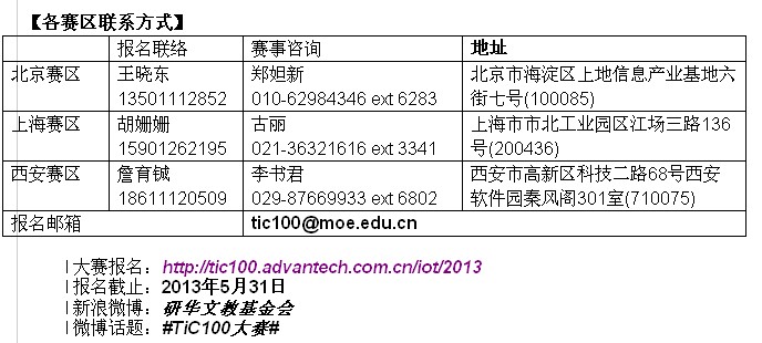 2013年5月2日,由教育部教育管理信息中心主辦,研華文教基金會(huì)、研華科技及中國(guó)電信共同協(xié)辦的【2013 TiC100智慧城市與物聯(lián)網(wǎng)創(chuàng)新經(jīng)營(yíng)模式大賽】(以下簡(jiǎn)稱此次大賽)三大賽區(qū)高;I備會(huì),于4月24日、26日、27日陸續(xù)在西安、上海、北京順利舉辦!
