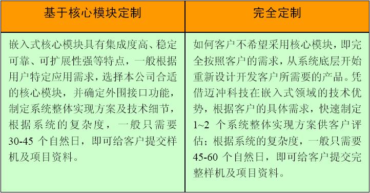 系統(tǒng)中最復(fù)雜、開(kāi)發(fā)難度最高的部分,均可由技術(shù)成熟、穩(wěn)定可靠的核心模塊提供,定制服務(wù)僅需要完成外圍接口電路的設(shè)計(jì),極大地降低了產(chǎn)品開(kāi)發(fā)難度,節(jié)約時(shí)間成本和資金成本;如果根據(jù)用戶(hù)需求,需要完全重新設(shè)計(jì),邁沖科技亦可依靠其技術(shù)優(yōu)勢(shì),以最小的成本為客戶(hù)提供滿(mǎn)意的技術(shù)服務(wù)。