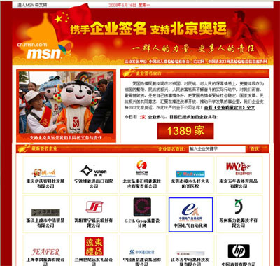 電氣自動(dòng)化網(wǎng)做為工控、電氣、自動(dòng)化行業(yè)的專業(yè)傳媒,更要把宣傳奧運(yùn),發(fā)揚(yáng)奧運(yùn)精神做了媒體了一種責(zé)任,今天電氣自動(dòng)化網(wǎng)積極參與了MSN組織的“攜手企業(yè)簽名 支持北京奧運(yùn)”的活動(dòng),并在第一時(shí)間光榮上榜!
