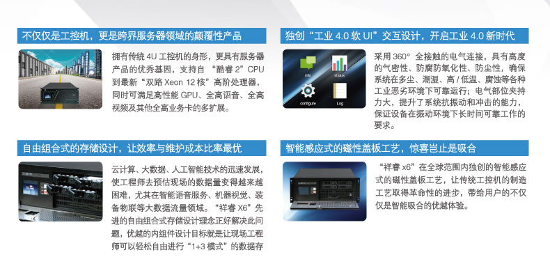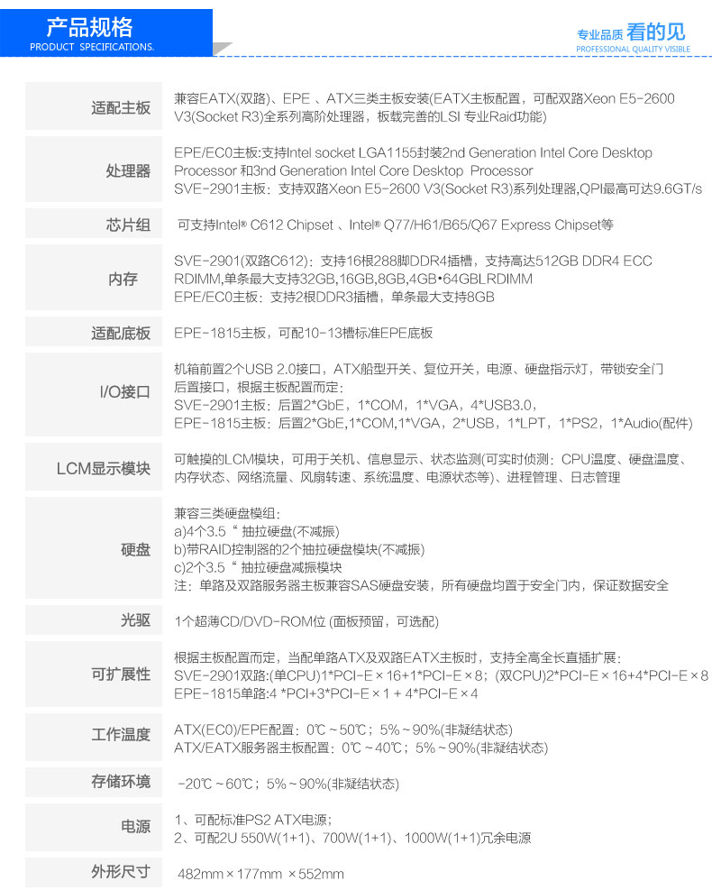 靈活的安裝能力,兼容ATX、EATX、EPE三類主板超強的存儲設計,最高兼容4個抽拉硬盤模塊/可選抗振或帶RAID功能時尚的U I界面,前面板嵌入LCM顯示模塊,外觀時尚,且可人機互動專業(yè)的散熱設計,保證雙路高階處理器及硬盤組合散熱通道暢通豐富的擴展功能,支持全高全長直插擴展簡易的安裝方法,上蓋免工具拆裝設計方式,便于拆裝維護專業(yè)的EMC設計,具有超強的抗電磁干擾和防輻射能力。