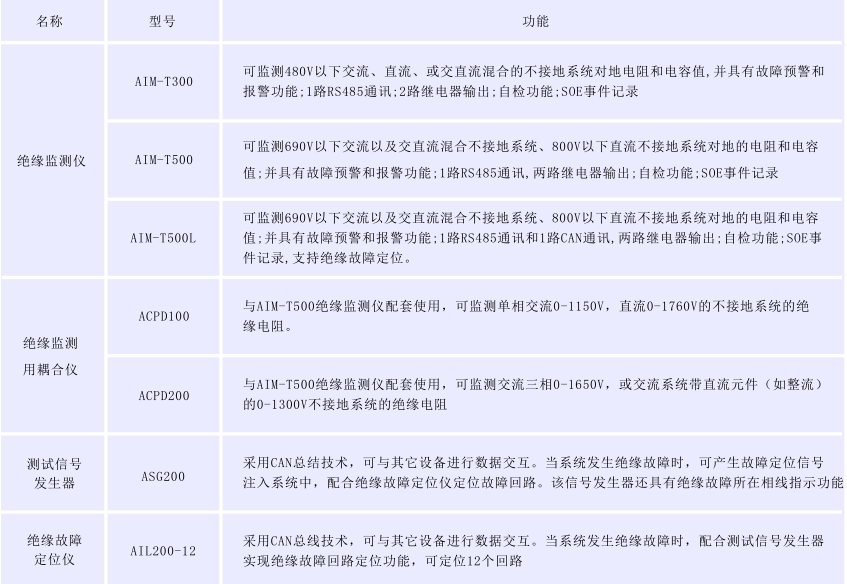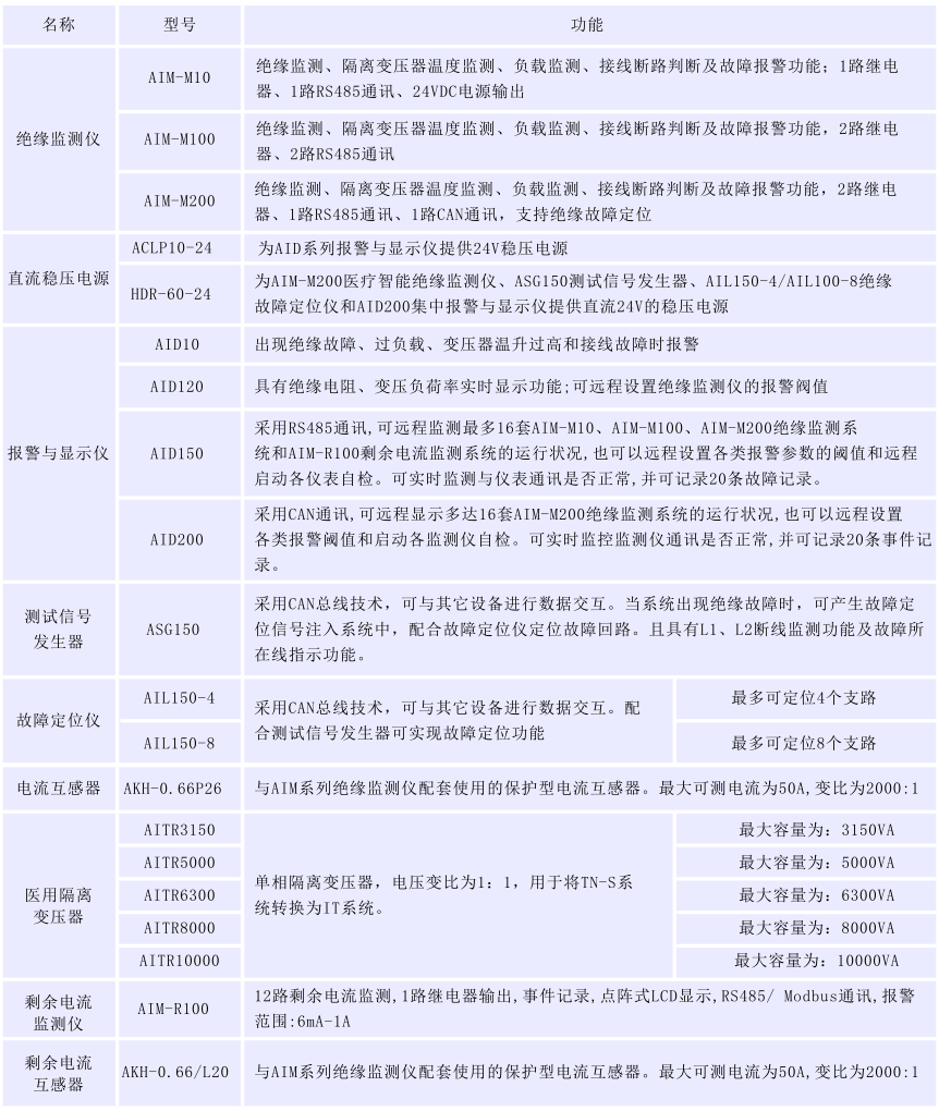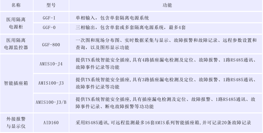 圖形顯示功能 系統(tǒng)可以以曲線的形式,顯示各IT配電系統(tǒng)的絕緣狀況、負(fù)載狀況,以及隔離變壓器的溫升狀況,以及它們的變化趨勢,以便于分管理人員了解和分析各電源系統(tǒng)的運行變化情況,有針對性的對某些系統(tǒng)進(jìn)行維護(hù)和保養(yǎng)。 設(shè)備選型 醫(yī)療IT配電監(jiān)測系統(tǒng)產(chǎn)品