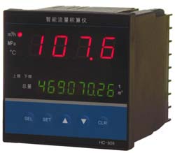 HC-908系列多功能流量積算儀 ●適用范圍 與各種流量傳感器或變送器、溫度傳感器或變送器和壓力變送器配合使用,可對各種液體、蒸汽、天然氣、一般氣體等流量參數(shù)進行測量顯示、累積計算、報警控制、變送輸出、數(shù)據采集及通訊。 ●功能特點 全范圍自動溫度、壓力補償運算,補償方式任意設定 線性積算、開方積算任意設定 瞬時流量、累積流量、溫度、壓力多種參數(shù)顯示 小信號切除功能,切除范圍0-5%可選 累積流量值可通過面板按鍵清零,清零操作可鎖 掉電保護功能,累積流量值掉電保持時間大于5年,所有設定值掉電后永久保持 先進的模塊化結構,配合功能強大的儀表芯片,功能組合、系統(tǒng)升級非常方便 ●主要技術指標 基本誤差:0.5%FS或 0.2%FS±1個字 分 辨 力:1/20000、14位A/D轉換器 顯示方式:雙排同時顯示,上排四位數(shù)碼管顯示瞬時流量,下排八位數(shù)碼管顯示累積流量采樣周期:0.5S 報警輸出:瞬時流量二限報警,繼電器輸出觸點容量 AC220V/3A 變送輸出: 4~20mA、0~10mA、1~5V、0~5V 精度:±0.3%FS 通訊輸出:接口方式--隔離串行雙向通訊接口RS485/RS422/RS232/Modem 波特率--300~9600bps內部自由設定 饋電輸出:DC24V/50mA 電 源:開關電源 85~265VAC 功耗4W以下