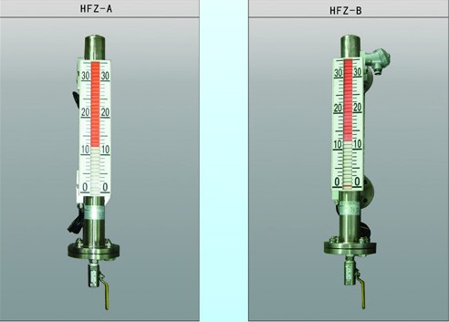 在桶槽外側(cè)裝置延伸旁路管,由旁路管外加裝液位指示器,將裝有磁鐵的浮球放進(jìn)旁路管內(nèi),因磁性色片內(nèi)裝著與浮球磁性相反之磁鐵,所以當(dāng)浮球上升時(shí)會(huì)推動(dòng)磁性色片翻轉(zhuǎn),磁性色片顏色會(huì)由白色翻轉(zhuǎn)為紅色,以指示實(shí)際液面高度。
