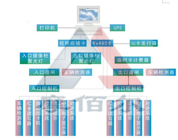 說明:各出入口設(shè)備按停車場(chǎng)標(biāo)準(zhǔn)布線設(shè)計(jì),電腦聯(lián)網(wǎng)如距離相距小于200米,采用五類雙絞線聯(lián)網(wǎng),大于200米必須使用光纖聯(lián)網(wǎng)。