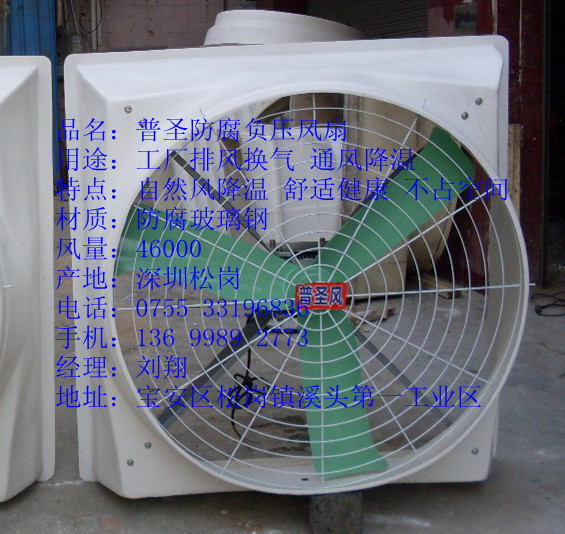 深圳普圣玻璃鋼防腐喇叭式抽風機工業(yè)廠房排風設(shè)備系列產(chǎn)品均采用CAD/CAM設(shè)計,具有噪音低、風量大、耗能小、運行平穩(wěn)、壽命長、效率高,并擁有百葉自動開啟、關(guān)閉系統(tǒng)。達到防塵、防水、美觀等效果。普圣牌工業(yè)廠房排風設(shè)備便于安裝,是工業(yè)廠房、倉庫、生產(chǎn)車間、大型飯?zhí)、配電室、機房等悶熱、異味、油煙、粉塵等通風不良場所及畜牧、養(yǎng)殖業(yè)用通風降溫除異味的最佳設(shè)備。產(chǎn)品特點說明:深圳普圣工業(yè)廠房排風設(shè)備為六葉壓鑄成型,強度高、不變形、耐腐蝕、耐高溫,根據(jù)流體力學原理設(shè)計的風葉角度使排氣效果達到最優(yōu)化,省電、風量大、噪音小、防空氣回流。玻璃鋼纖維外框材質(zhì),高強度、耐腐蝕、不分解的特點。 根據(jù)流體力學原理優(yōu)化風道設(shè)計,每小時排風量46000-48000立方米,1臺風機可保證800立方米車間每分鐘換氣一次,所匹配功率僅為0.75千瓦。 PVC氣動百葉窗,隨氣流自動開閉,防雨防塵,美觀、堅實耐用、安裝不占用空間,適用于任何工業(yè)廠房通風和降溫使用。