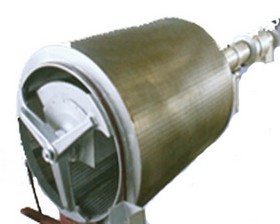 設(shè)備與水平面呈35°安裝在水渠中,污水從鼓的端頭流入鼓中,水通過柵網(wǎng)的柵縫流出, 固體垃圾被過濾在柵網(wǎng)筐內(nèi),帶有耙齒的清潔臂在圓周運(yùn)動(dòng)時(shí)清理格柵縫隙,耙齒伸入柵網(wǎng)中,將固體取出,當(dāng)清潔臂處于最高點(diǎn)時(shí),通過水的沖洗及擋渣板的作用, 將垃圾從耙齒上清除下來,并掉入垃圾收集裝置螺旋輸送斗中,在輸送過程中通過變螺距的作用被脫水,在最上端壓縮區(qū)被擠干,而擠壓水被回流至水渠, 垃圾最后送入集裝箱或后繼設(shè)備,再進(jìn)行處理。