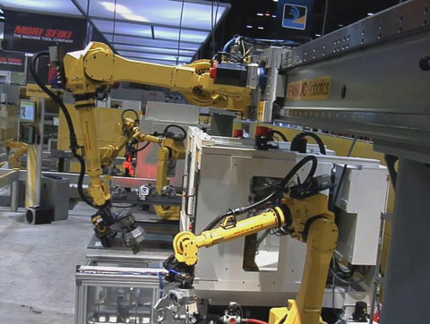 針對客戶工件的復(fù)雜性,馬丁路德的機器人集成采用了FANUC的IRVISION 3D視覺系統(tǒng),用于檢測工件3維位置,從而保證機器人抓手能精確抓取工件送到加工中心的工裝夾具位置。同時地面的搬運機器人通過視覺系統(tǒng)引導(dǎo)把工件放到料倉指定的位置上。