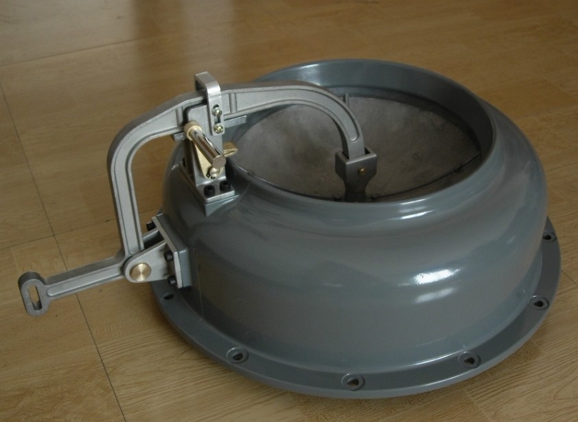 超壓防爆排氣活門主要用于防護(hù)工程的排風(fēng)口,平時(shí)處于關(guān)閉狀態(tài),當(dāng)需要進(jìn)行濾毒通風(fēng)時(shí),工程內(nèi)部必須造成并保持30-50Pa超壓,此時(shí)活門的閥蓋在超壓作用下自動(dòng)開(kāi)啟,以排除防毒通道內(nèi)的毒氣。當(dāng)戰(zhàn)時(shí)需要進(jìn)行隔絕防護(hù)時(shí),用人工將閥蓋鎖緊,此時(shí)活門具有防護(hù)密閉功能。