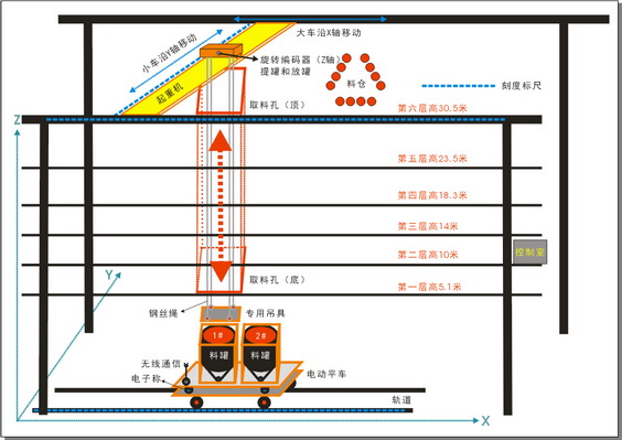 自動控制核心點: 1. 位置檢測:電動平車自身取料,起重機調(diào)運重罐和回放空罐,起升高度檢測; 2. 專用吊具:自動掛鉤和摘鉤; 3. 防搖擺:料罐重載或空載時穿過六層樓板的5米方孔提升或回放32米,取料孔到料倉運行; 4. 料重檢測:料罐重載和空載判斷,加料重量; 5. 軟件思想:工作循環(huán)13分鐘時間控制,自動尋找需要卸料的料倉,防搖擺控制。