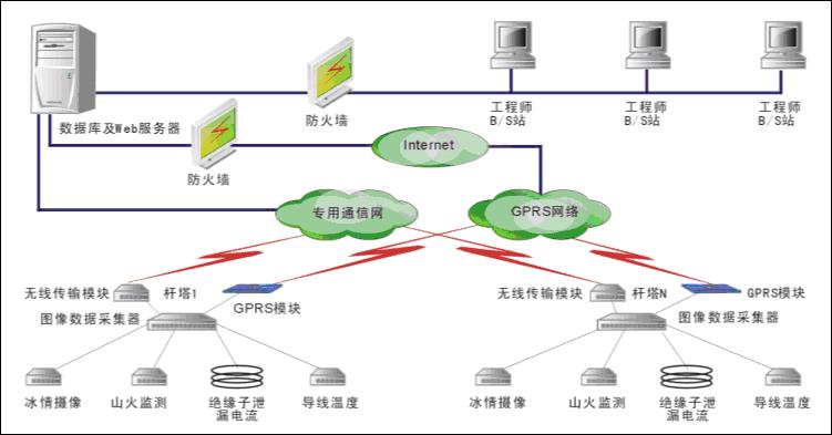遠(yuǎn)程數(shù)據(jù)圖像采集器是一臺(tái)高性能的嵌入式計(jì)算機(jī),它部署在圖像監(jiān)控的現(xiàn)場(chǎng),它從CCD攝像機(jī)采集模擬視頻信號(hào),然后把圖像數(shù)據(jù)進(jìn)行編碼和壓縮成為數(shù)字視頻數(shù)據(jù);通過(guò)485數(shù)據(jù)采集擴(kuò)展版,將高壓傳輸線路的導(dǎo)線泄漏電流、絕緣子污穢、雷電電流、導(dǎo)線溫度、環(huán)境溫濕度、線路走廊山火(環(huán)境CO2含量)、現(xiàn)場(chǎng)風(fēng)速雨量等現(xiàn)場(chǎng)數(shù)據(jù)實(shí)時(shí)采集并本地緩存。最后利用EDGE無(wú)線傳輸模塊將圖片及現(xiàn)場(chǎng)數(shù)據(jù)以IP包的方式發(fā)送到圖像數(shù)據(jù)監(jiān)控服務(wù)器。圖像數(shù)據(jù)監(jiān)控服務(wù)器和圖像數(shù)據(jù)監(jiān)控客戶端分別是裝有遠(yuǎn)程圖像監(jiān)控服務(wù)端軟件和客戶端軟件的PC機(jī),它們都連接在互連網(wǎng)絡(luò)上,由于遠(yuǎn)程數(shù)據(jù)圖像采集器沒(méi)有固定的IP地址,所以客戶端主動(dòng)去瀏覽監(jiān)控圖像和設(shè)置監(jiān)控參數(shù)都是通過(guò)服務(wù)器來(lái)中轉(zhuǎn)的。