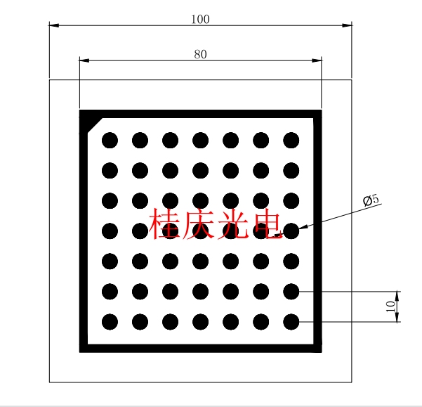 | 產(chǎn)品型號 | 圖形尺寸 | 圓點直徑 | 中心距 | 陣列 | | GQ-H5-0.3125 | 5*5 | 0.3125 | 0.625 | 7*7 | | GQ-H8-0.5 | 8*8 | 0.5 | 1 | 7*7 | | GQ-H10-0.625 | 10*10 | 0.625 | 1.25 | 7*7 | | GQ-H15-0.9375 | 15*15 | 0.9375 | 1.875 | 7*7 | | GQ-H20-1.25 | 20*20 | 1.25 | 2.5 | 7*7 | | GQ-H25-1.5625 | 25*25 | 1.5625 | 3.125 | 7*7 | | GQ-H30-1.875 | 30*30 | 1.875 | 3.75 | 7*7 | | GQ-H64-4 | 64*64 | 4 | 8 | 7*7 | | GQ-H100-6.25 | 100*100 | 6.25 | 12.5 | 7*7 | | GQ-H150-9.375 | 150*150 | 9.375 | 18.75 | 7*7 | | 以上是常用規(guī)格,可按照圖紙要求訂做 |