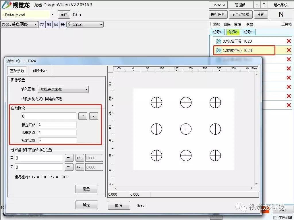 根據(jù)擬定好的通訊協(xié)議,可完成運(yùn)動(dòng)平臺(tái)與相機(jī)的自動(dòng)旋轉(zhuǎn)中心標(biāo)定流程。