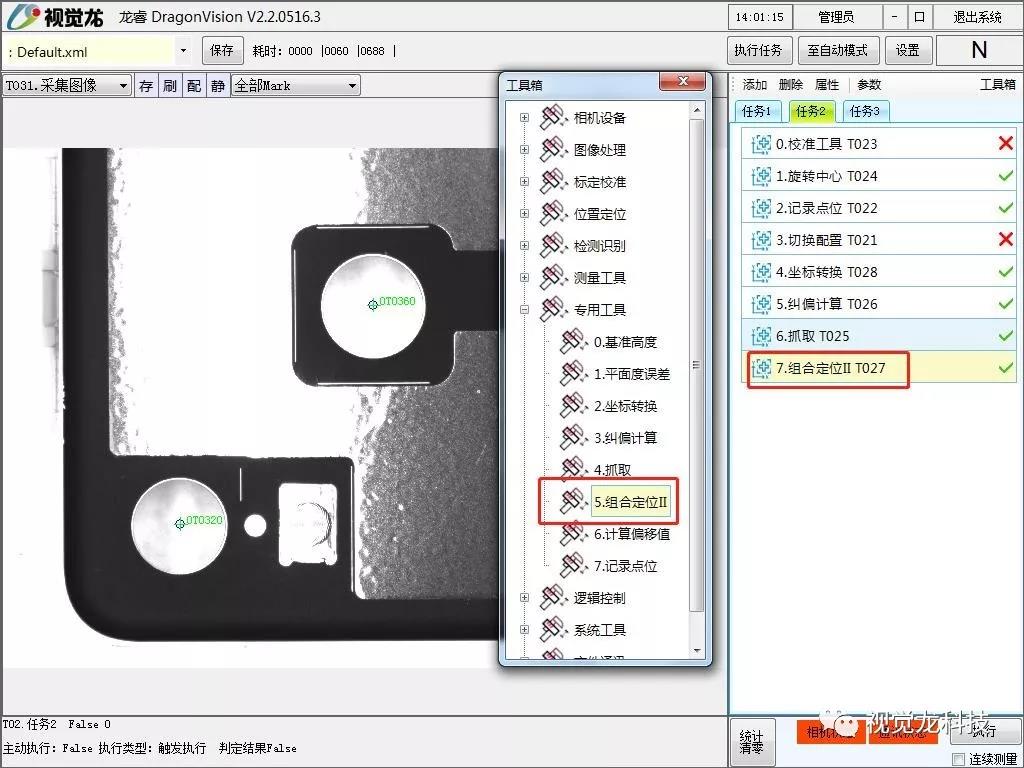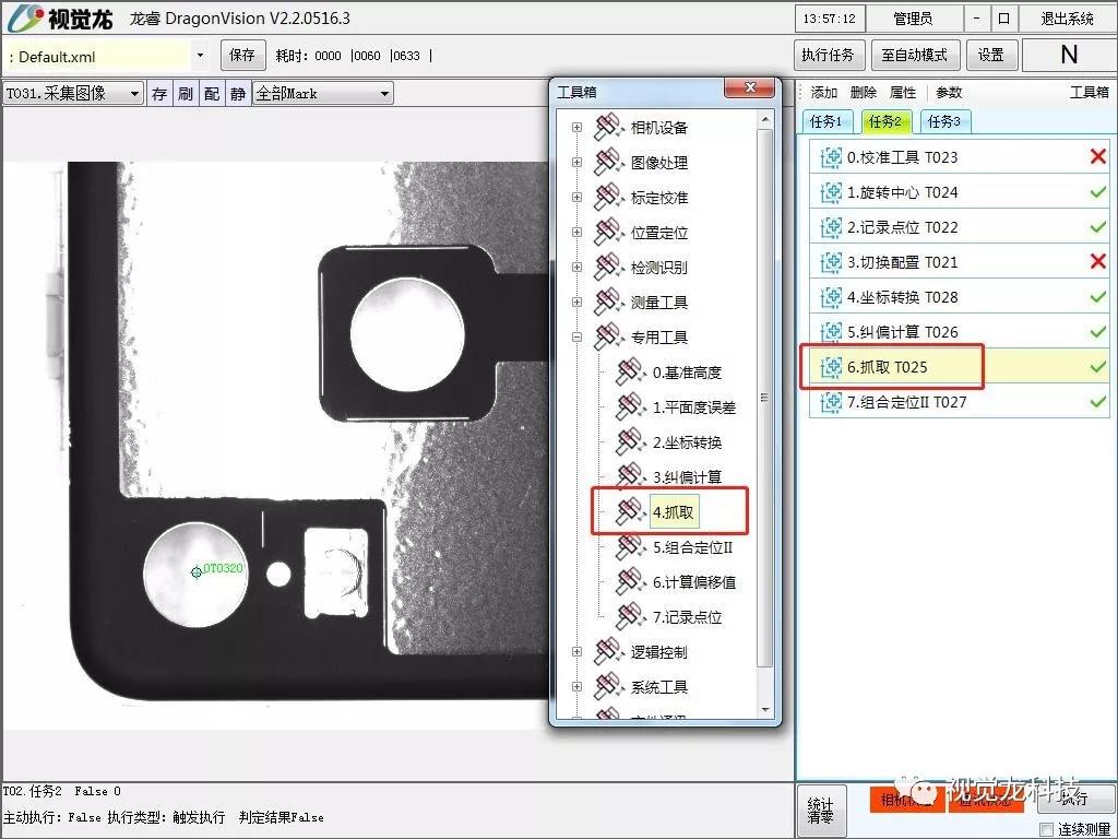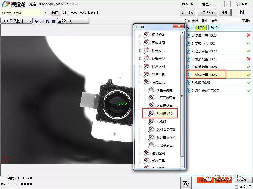 “龍睿DragonVision智能相機(jī)”專用型新增自動(dòng)標(biāo)定功能、坐標(biāo)轉(zhuǎn)換工具、糾偏計(jì)算工具、抓取工具、組合定位工具、記錄點(diǎn)位工具、切換配置工具等。可以用于貼輔料、背光板膜片貼合、液晶屏組裝、IC芯片貼合等。