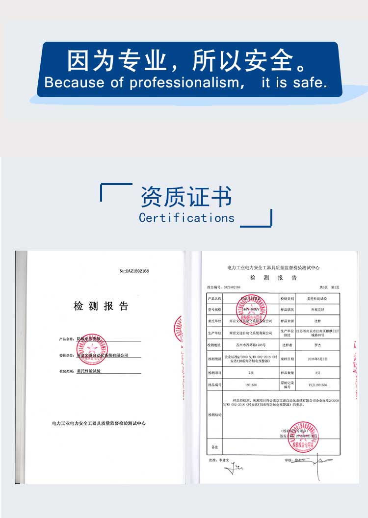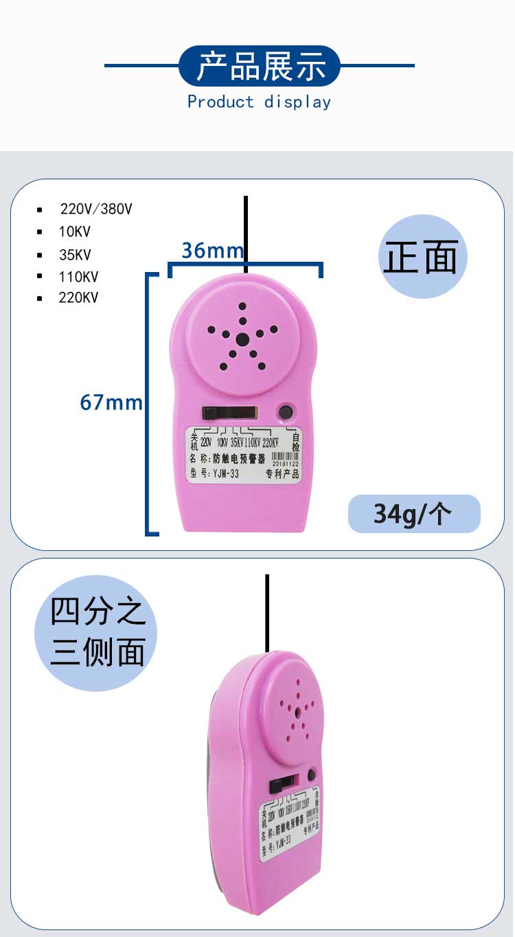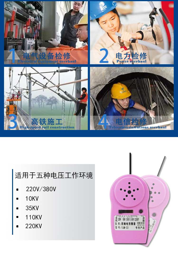 YJM-33時(shí)安達(dá)®防觸電語(yǔ)音預(yù)警器產(chǎn)品簡(jiǎn)介:YJM-33時(shí)安達(dá)®防觸電語(yǔ)音預(yù)警器適用于電力行業(yè)220V-220KV工作環(huán)境,五個(gè)電壓報(bào)警檔位可選,獨(dú)創(chuàng)的多段語(yǔ)音播報(bào)方式,實(shí)現(xiàn)真正的語(yǔ)音播報(bào),使用簡(jiǎn)單方便、微安級(jí)靜態(tài)功耗,是電工特種作業(yè)人員極為有效地輔助安全用品。 產(chǎn)品適用范圍:YJM-33防觸電語(yǔ)音預(yù)警器適用于220/380V、10KV、35KV、110KV、220KV的工作環(huán)境,產(chǎn)品適合于發(fā)、變、送、配、農(nóng)電和在電氣設(shè)備上工作的人員使用,是電工特種作業(yè)人員的一種極為有效的輔助安全用品。 報(bào)警距離:電壓等級(jí) | *DL 409-91中最小安全距離(M) | 報(bào)警距離 | 0.22/0.38KV |