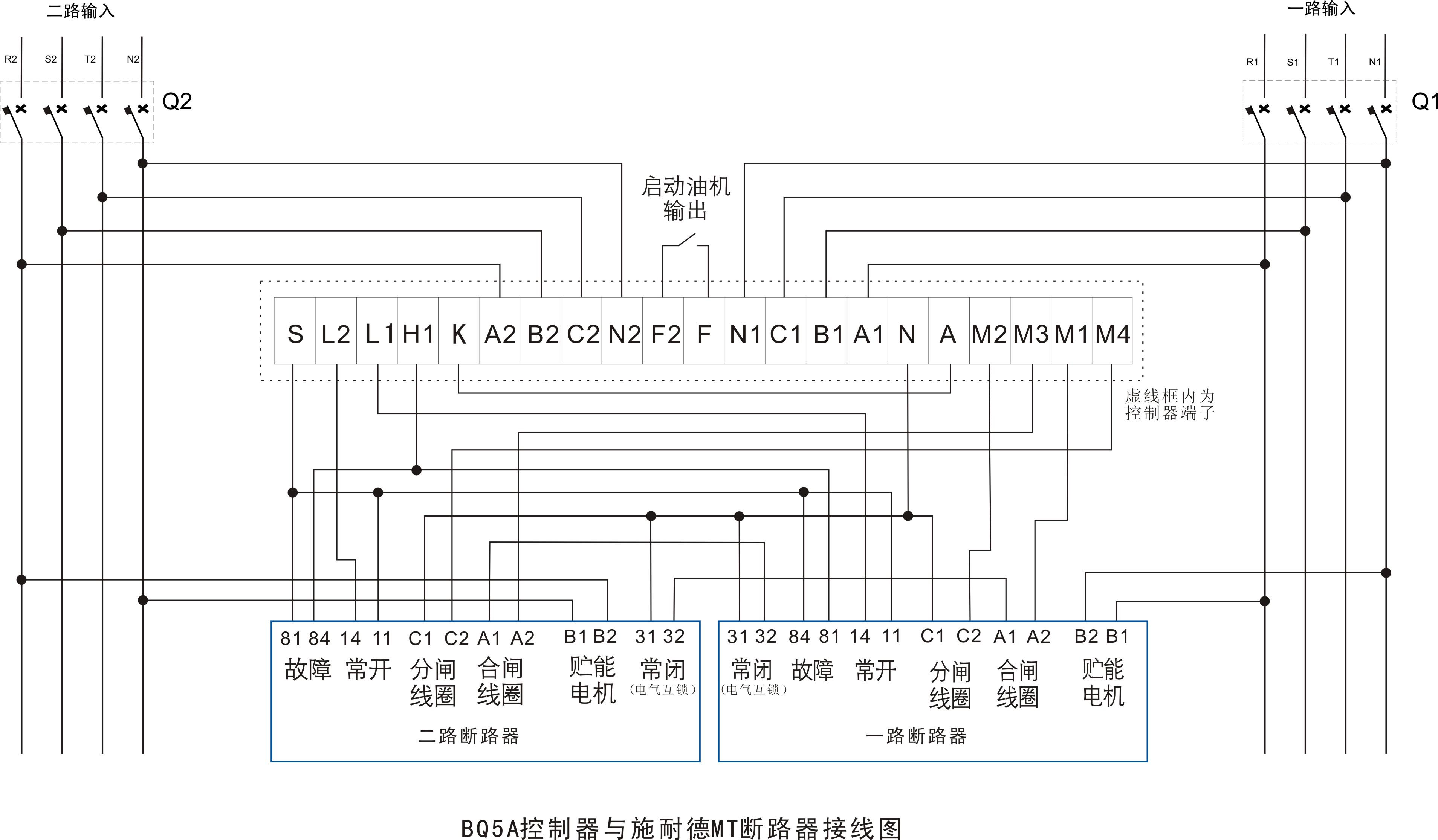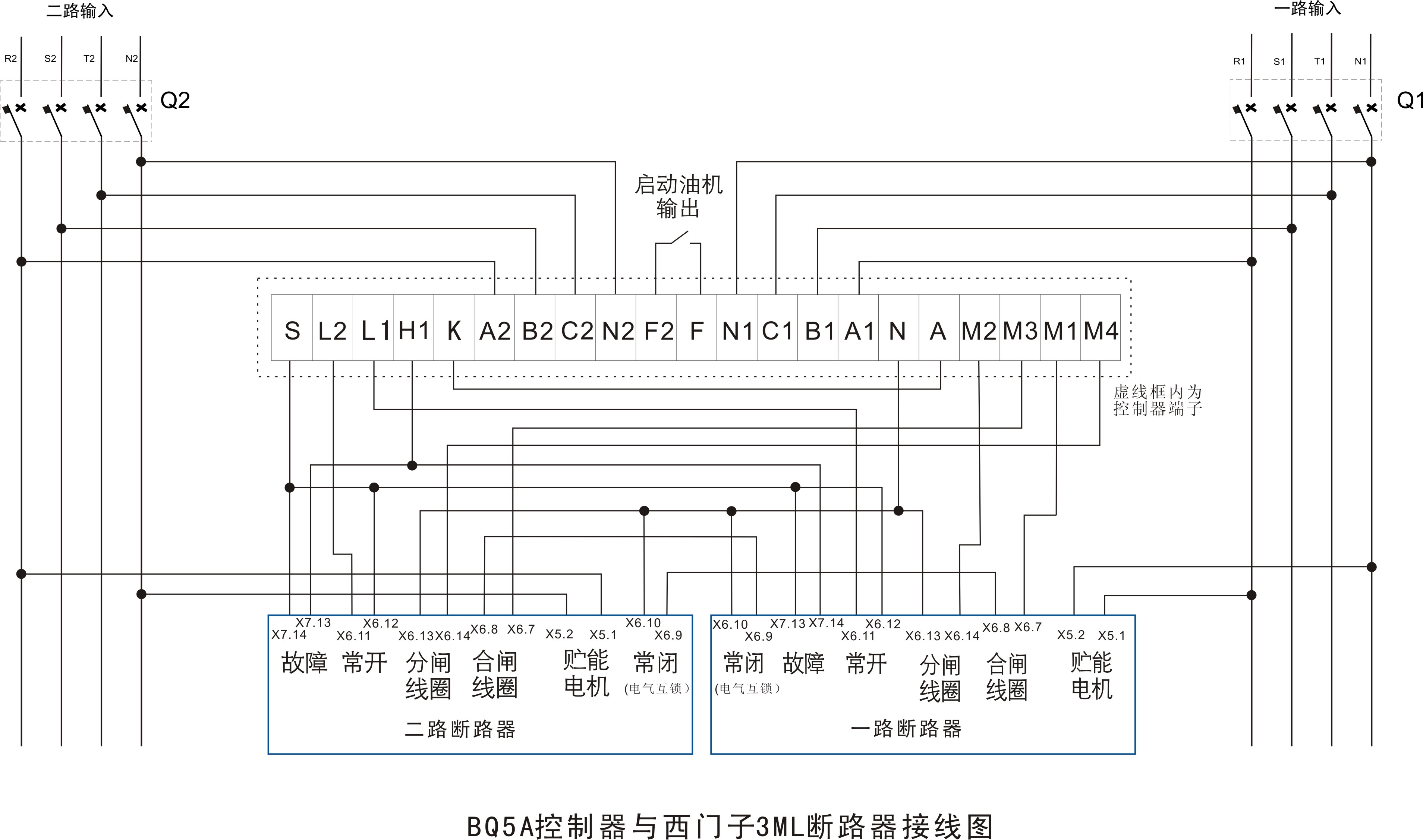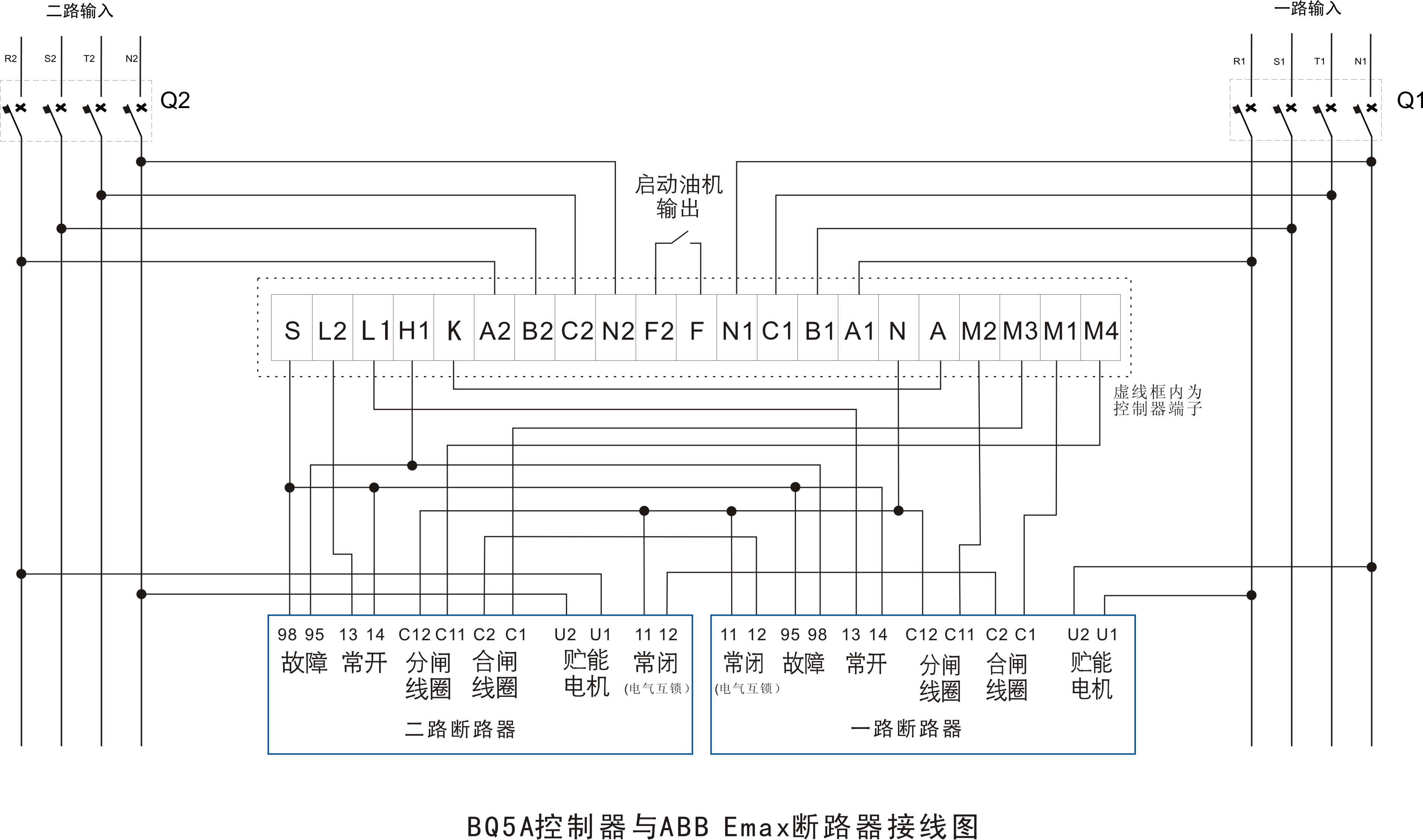 1.電源: 交流輸入:取自一二路A、N相電壓,只要其中一路有電,即可工作,單相電壓>170V。(該系統(tǒng)要求接N) 交流輸入電壓范圍:0-279V(單相)╱0-482V(三相)50Hz 輸入三相電流:0-5A(額定) 2.繼電器輸出容量:10A 220VAC 3.控制器接線端子說明 A1,B1,C1,N1:接一路電源 A2,B2,C2,N2:接二路電源 K,N:控制器輸出電源,以上兩路電源只要任何一路有電源輸入,K、N就有AC220V電源輸出 A:控制器M1、M2、M3、M4內(nèi)部無源公共接點,一般接K M1:一路合閘輸出 M2:一路分閘輸出 M3:二路合閘輸出 M4:二路分閘輸出 S:一二路斷路器輔助及報警公共接點 L1:控制器一路合閘指示,接一路斷路器輔助常開 L2:控制器二路合閘指示,接二路斷路器輔助常開 H1:控制器兩路報警指示,接一路和二路斷路器報警常開 F,F(xiàn)2:油機啟動輸出接點,一路電源不正常時,會自動輸出啟動信號