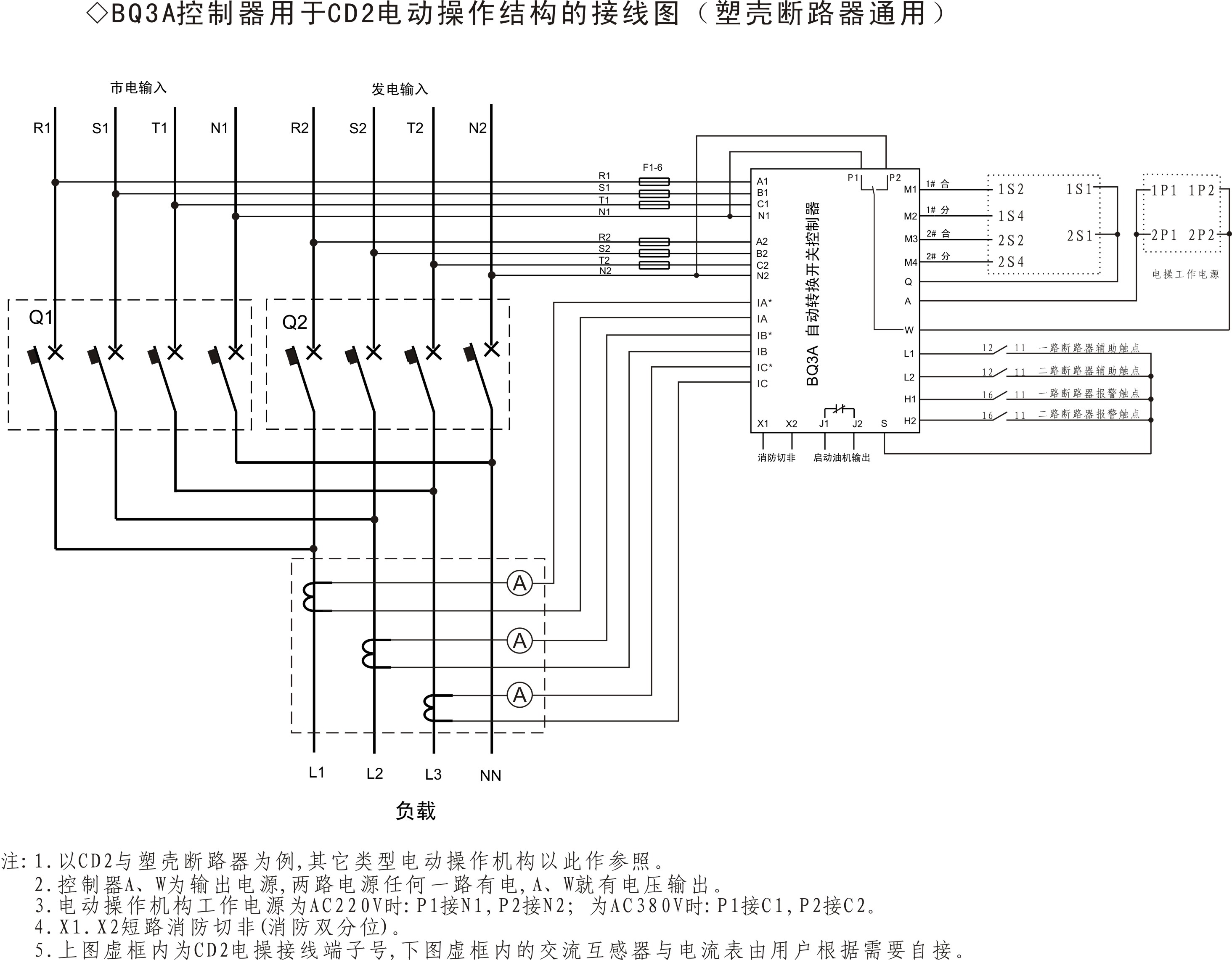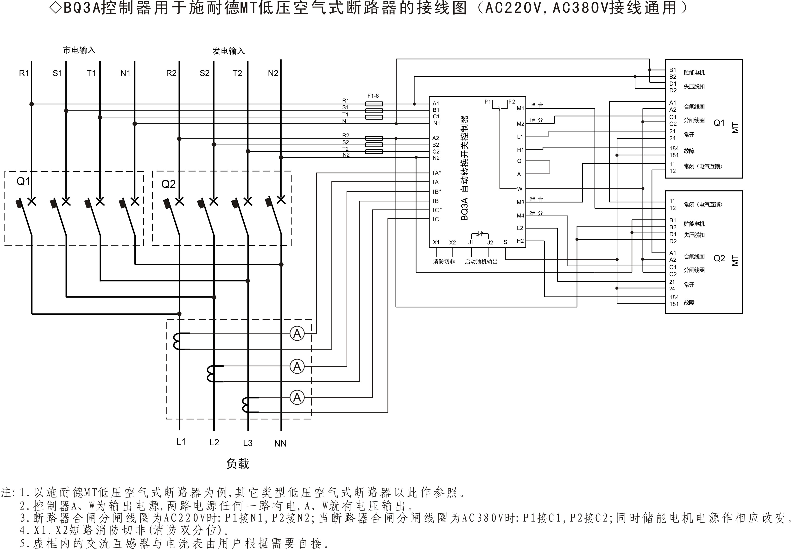 使用方法 A1,B1,C1,N1:接一路電源(默認(rèn)市電) A2,B2,C2,N2:接二路電源(默認(rèn)市電,也可為發(fā)電機(jī)) A、W:控制器輸出電源,以上兩路電源只要任何一路有電源輸入,A、W就有電源輸出 P1 P2:斷路器合閘分閘線圈電壓選擇;當(dāng)合閘分閘線圈為AC220V時(shí),P1接N1、P2接N2;當(dāng)合閘分閘線圈為AC380V時(shí),P1接電源C1,P2接電源C2 Q:控制器M1、M2、M3、M4內(nèi)部無(wú)源公共接點(diǎn),一般接A M1:一路合閘輸出 M2:一路分閘輸出 M3:二路合閘輸出 M4:二路分閘輸出 S:一二路斷路器輔助及報(bào)警公共接點(diǎn) L1:控制器一路合閘指示,接一路斷路器輔助常開 L2:控制器二路合閘指示,接二路斷路器輔助常開 H1:控制器一路報(bào)警指示,接一路斷路器報(bào)警常開 H2:控制器二路報(bào)警指示,接二路斷路器報(bào)警常開 J1 J2:油機(jī)啟動(dòng)輸出接點(diǎn),一路電源不正常時(shí),會(huì)自動(dòng)輸出啟動(dòng)信號(hào) X1 X2:消防切非(X1與X2短路斷路器全部分閘)