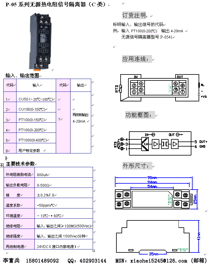 P-05系列無(wú)源熱電阻信號(hào)隔離器(一入一出) 帕羅肯科技有限公司
