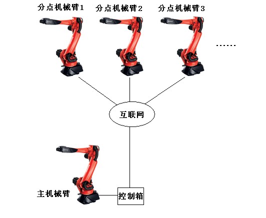 一臺主控機械手臂(機器人、機械手掌、直線滑臺等)的實時動作,可通過有線網絡、無線WIFI、串口、485以及互聯網云等通信技術,遠程傳輸到各分點的機械手臂,然后控制所有分點的機械手臂與主控機械手臂進行同步動作,即主控機械手臂的一舉一動都會通過通訊網絡實時傳輸到各分點(機器人),然后各分點機械臂即能實時做出與遠程主控機械手臂完全一模一樣的動作。