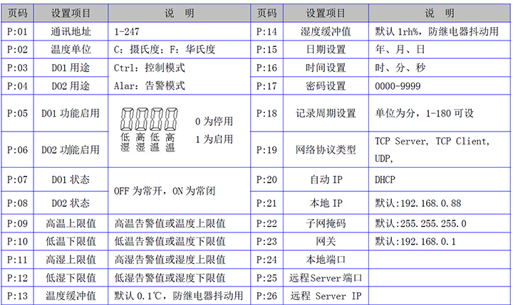 五、操作說明 在初始頁面下,按“向上”“向下”鍵可以切換顯示:Td(露點(diǎn))、ID(地址)、DO1(第一路開關(guān)量狀態(tài))、DO2(第二路開關(guān)量狀態(tài))、Date(日期月:日)和時(shí)間(時(shí):分)。 設(shè)置操作:在初始頁面下,按“SET”鍵提示輸入密碼,初始密碼為“0000”,此時(shí)閃動(dòng)的位按“向上”“向下”鍵可以進(jìn)行調(diào)整,按“SET”鍵可以移位,輸入正確密碼后按下“ENTER”鍵即可進(jìn)入設(shè)置頁面,參數(shù)設(shè)置頁面共有26頁,按“向上”“向下”鍵可以選擇需要設(shè)置的項(xiàng)目,按下“ENTER”鍵可以設(shè)置當(dāng)前項(xiàng)目的參數(shù),參數(shù)調(diào)整OK后,按下“ENTER”鍵保存設(shè)置,再按“SET”鍵可返回到初始頁面。