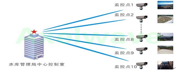 該系統(tǒng)主要由三部分組成,前端視頻、語音、數(shù)據(jù)等采集系統(tǒng),無線網(wǎng)絡(luò)傳輸系統(tǒng),水庫管理中心控制系統(tǒng)。前端的多路視頻、數(shù)據(jù)及IP電話等都先通過交換機(jī)進(jìn)行匯聚,然后進(jìn)入艾克賽爾(Axelwave)的無線網(wǎng)橋進(jìn)行無線傳輸,所有前端點(diǎn)都采用太陽能供電系統(tǒng)供電,在陰雨條件下可以支持連續(xù)工作72小時(shí)以上。中心水庫管理控制室與前端組成點(diǎn)對多點(diǎn)的無線傳輸鏈路,將前端的所有信息匯總至控制室?刂浦行目梢詫(shí)時(shí)監(jiān)控各前端點(diǎn)的視頻圖像,如水庫水位情況,閘門、大壩的工作狀態(tài),水面及岸邊情況等等,另外還能觀察到前端發(fā)回各種的實(shí)時(shí)數(shù)據(jù)信息,如水庫水質(zhì)變化、水庫天氣變化等,真正做到對水庫各重點(diǎn)區(qū)域的全天候、多角度、全方位的實(shí)時(shí)監(jiān)控,做到有效應(yīng)對各種突發(fā)事件,確保了水庫各方面的安全運(yùn)行。