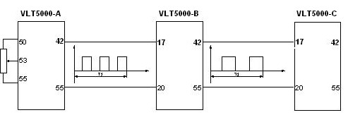 系統(tǒng)由5臺VLT5000系列變頻器及輔助的開關(guān)、指示燈、電位器及必要的空開等電氣器件組成。圖-1中A變頻器的速度作為主速給定(它自身的速度由外部電位器給定), A變頻器的42號端子對應(yīng)自身輸出轉(zhuǎn)速,自動的轉(zhuǎn)化為脈沖信號(頻率)輸出給B變頻器,作為B變頻器的速度給定信號(通過B變頻器的29號端子來接收脈沖信號),然后再由B變頻器通過修改內(nèi)部參數(shù)327號,經(jīng)過計(jì)算后相應(yīng)的輸出一定的轉(zhuǎn)速。同理B變頻器對應(yīng)自身輸出轉(zhuǎn)速自動的轉(zhuǎn)化為脈沖信號(頻率)通過42號端子輸出脈沖信號(頻率)作為C變頻器的速度給定信號(通過C變頻器的29號端子來接收脈沖信號),以此類推,一直到E變頻器。在此過程中,所有速度給定信號都是數(shù)字式的(既速度信號通過給定的脈沖頻率的變化,結(jié)合自身內(nèi)部的計(jì)算實(shí)現(xiàn)不同的轉(zhuǎn)速)。