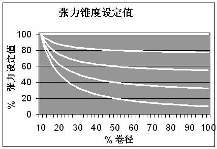 有了卷筒直徑,就能根據(jù)張力和錐度設定給出張力錐度的設定值。丹佛斯中心卷繞卡的張力錐度設定值變化曲線如圖四,當張力錐度設為0時,表示恒張力,張力設定值與卷徑無關;當張力錐度設為100%時,表示恒轉(zhuǎn)矩,卷徑每增加一倍張力就減小一半。