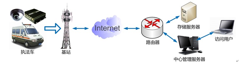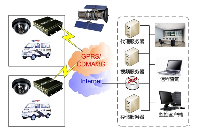 本系統(tǒng)利用GPRS/CDMA/3G無線網(wǎng)絡(luò)將視頻信號(hào)從前端監(jiān)控?cái)z像點(diǎn)傳輸?shù)奖O(jiān)控中心,監(jiān)控中心可以通過專線或Internet連接到機(jī)房與無線網(wǎng)絡(luò)的分組數(shù)據(jù)服務(wù)節(jié)點(diǎn)連接。
