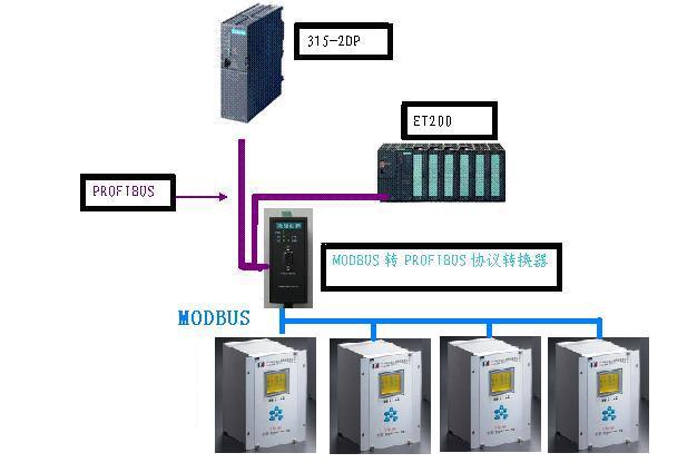電力分站中需要解決的一個(gè)問題是將不帶有PROFIBUS接口的綜合保護(hù)器接入到PROFIBUS總線系統(tǒng)中。在雞西某煤礦井下電網(wǎng)安全監(jiān)控系統(tǒng)的電力分站中,PLC選用西門子S7300系列315-2DP,綜合保護(hù)器選用天津天礦的產(chǎn)品。天津天礦的綜合保護(hù)器產(chǎn)品不帶有PROFIBUS通訊接口,只有RS485通訊接口,因此不能直接將綜合保護(hù)器接入到西門子PLC中。應(yīng)用北京微硬創(chuàng)新科技有限公司的MODBUS轉(zhuǎn)PROFIBUS網(wǎng)關(guān)和RS485轉(zhuǎn)PROFIBUS網(wǎng)橋,將天津天礦的綜合保護(hù)器接入到PROFIBUS總線中,系統(tǒng)示意圖如下: