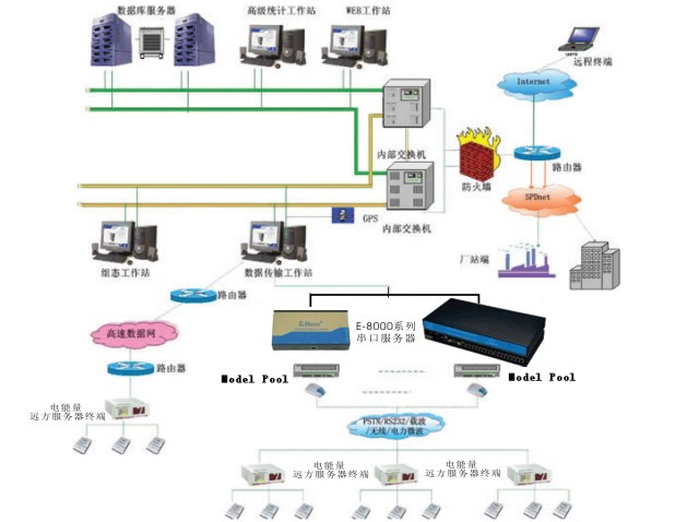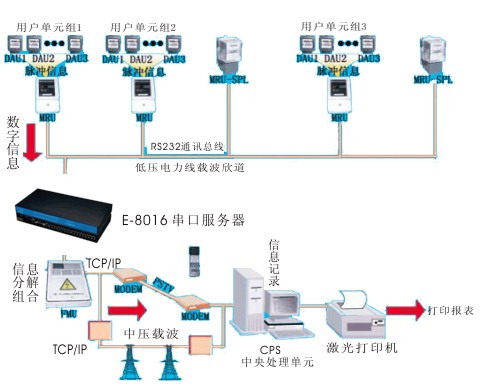 在電力抄表自動化系統(tǒng)中,應用E-Base E-8000系列串口通訊服務器,提供的32個串行接口滿足了眾多電表的串口轉換,RS232/422/485接口可以共存于一臺服務器中,供用戶任意選擇。