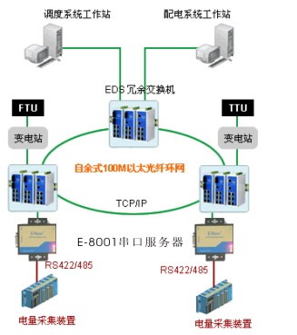 應用 E-8001單串口RS232/422/485三合一界面通訊服務器將變電站中的電量采集裝置通TCP/IP協(xié)議連入電力通訊網(wǎng)絡上 ,電量采集裝置為RS422或RS485接口的設備,E-8001系統(tǒng)結構簡單,通訊協(xié)議為TCP/IP,安裝、調試方便,在遠程直接可以進行維護(同一網(wǎng)段的任何地方)。同時E-8001串口服務器支持TCP/IP socket和虛擬COM 口方式,并提供TCP/IP server、client模式和UDP模式。