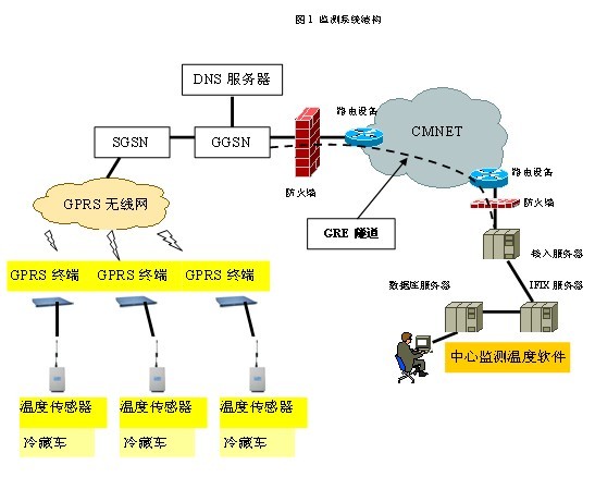 溫度監(jiān)測中心要和每一輛冷藏車實現(xiàn)實時連接。由于溫度信息采集點數(shù)量眾多,系統(tǒng)要求能滿足突發(fā)性數(shù)據(jù)傳輸?shù)男枰,而GPRS技術(shù)能很好地滿足傳輸突發(fā)性數(shù)據(jù)的需要。