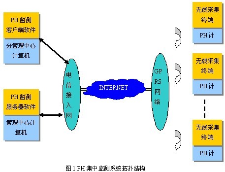 圖中的PH計(jì)放置在每個(gè)需要監(jiān)測(cè)的監(jiān)測(cè)點(diǎn),每個(gè)PH計(jì)通過(guò)串口連接一個(gè)無(wú)線采集終端,采集終端通過(guò)GPRS無(wú)線上網(wǎng),將數(shù)據(jù)通過(guò)INTERNET互聯(lián)網(wǎng)傳輸?shù)焦芾碇行摹?/DIV>