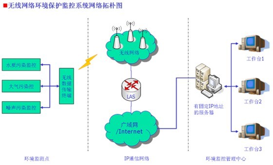 系統(tǒng)主要是由一個(gè)監(jiān)測(cè)中心,若干個(gè)固定監(jiān)測(cè)站和專用GPRS/CDMA無(wú)線終端組成。監(jiān)測(cè)中心對(duì)各個(gè)監(jiān)測(cè)站進(jìn)行控制指揮,各監(jiān)測(cè)站收集各種污染參數(shù),兩者間的控制信號(hào)和監(jiān)測(cè)數(shù)據(jù)通過(guò)GPRS/CDMA無(wú)線終端傳送完成。監(jiān)測(cè)中心既是各監(jiān)測(cè)站的指揮中心,又是監(jiān)測(cè)站監(jiān)測(cè)數(shù)據(jù)的匯集、處理的存儲(chǔ)的數(shù)據(jù)庫(kù)。各監(jiān)測(cè)站可設(shè)置為自動(dòng)向監(jiān)測(cè)中心發(fā)送信息;也可設(shè)置為平時(shí)處于待機(jī)狀態(tài),在收到監(jiān)測(cè)中心的指令后才開(kāi)始啟動(dòng)工作,將信息發(fā)送給監(jiān)控中心。各監(jiān)測(cè)站有數(shù)據(jù)采集。命令識(shí)別、數(shù)據(jù)發(fā)送的功能。