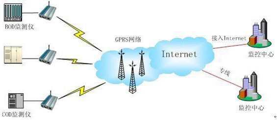 在水質(zhì)系統(tǒng)中,常常需要對(duì)眾多的排污口污水的PH值、DO、溫度、電導(dǎo)和排污流量進(jìn)行實(shí)時(shí)監(jiān)控實(shí)時(shí)監(jiān)測(cè),大部分監(jiān)測(cè)數(shù)據(jù)需要實(shí)時(shí)發(fā)送到管理中心的后端服務(wù)器進(jìn)行處理。由于監(jiān)測(cè)點(diǎn)分散,分布范圍廣,而且大多設(shè)置在環(huán)境較惡劣的地區(qū),通過(guò)電話線傳送數(shù)據(jù)往往事倍功半,通過(guò)GPRS/CDMA/EDGE無(wú)線網(wǎng)絡(luò)進(jìn)行數(shù)據(jù)傳輸,成為水質(zhì)監(jiān)測(cè)部門選擇的通信手段之一。污染源監(jiān)測(cè)設(shè)備可將采集到的污染數(shù)據(jù)和告警信息通過(guò)GPRS/CDMA無(wú)線網(wǎng)絡(luò)同時(shí)發(fā)送到多個(gè)水質(zhì)監(jiān)測(cè)部門,實(shí)現(xiàn)對(duì)排污單位或個(gè)人的及時(shí)管理,可以大大提高環(huán)保部門的工作效率。