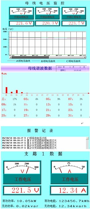 主要檢測數(shù)據(jù)對象有母線電流、電壓、功率、電能、母線諧波數(shù)據(jù),各個支路電壓、電流、功率、電能,及各個支路的分合狀態(tài)。顯示以數(shù)字顯示、折線圖、條形圖為主,見圖3。