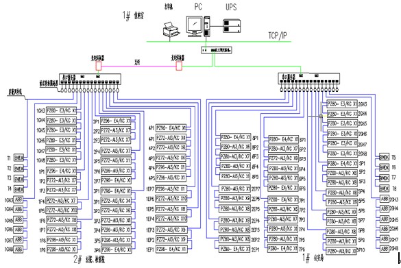 嘉定司法中心的值班室位于1#公安局負(fù)一層變配電室旁,配置一臺工業(yè)網(wǎng)絡(luò)交換機(jī);2#變配電室現(xiàn)場采用13根總線,使用一臺16口的串口服務(wù)器,通過光纖連接至1#值班室內(nèi)的交換機(jī)上;1#變配電室現(xiàn)場采用13根總線,使用一臺16口的串口服務(wù)器,連接至值班室內(nèi)的交換機(jī);再通過大樓的局域網(wǎng)把數(shù)據(jù)傳輸?shù)胶笈_系統(tǒng)。