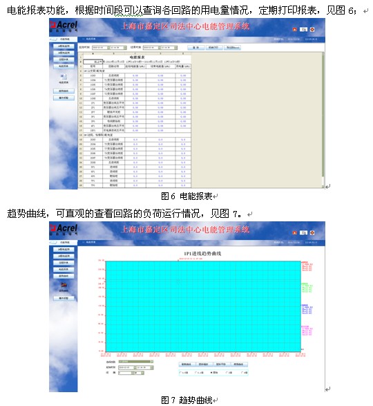 Acrel-3000電能管理系統(tǒng)具有通用性好、可靠性高、組態(tài)靈活等優(yōu)點(diǎn),在嘉定司法中心項(xiàng)目上得以成功應(yīng)用。隨著計算機(jī)信息技術(shù)的普及,低壓配電智能化的要求也越來越高,變配電監(jiān)控及低壓配電管理使得實(shí)現(xiàn)配電室的無人職守真正成為現(xiàn)實(shí),系統(tǒng)對各種用電設(shè)備的歷史運(yùn)行數(shù)據(jù)和狀態(tài)進(jìn)行管理分析,便于維護(hù)人員明確設(shè)備狀況,制定詳細(xì)的設(shè)備維護(hù)計劃,減少人力投入,提高工作效率,從而降低整個系統(tǒng)的運(yùn)營成本。