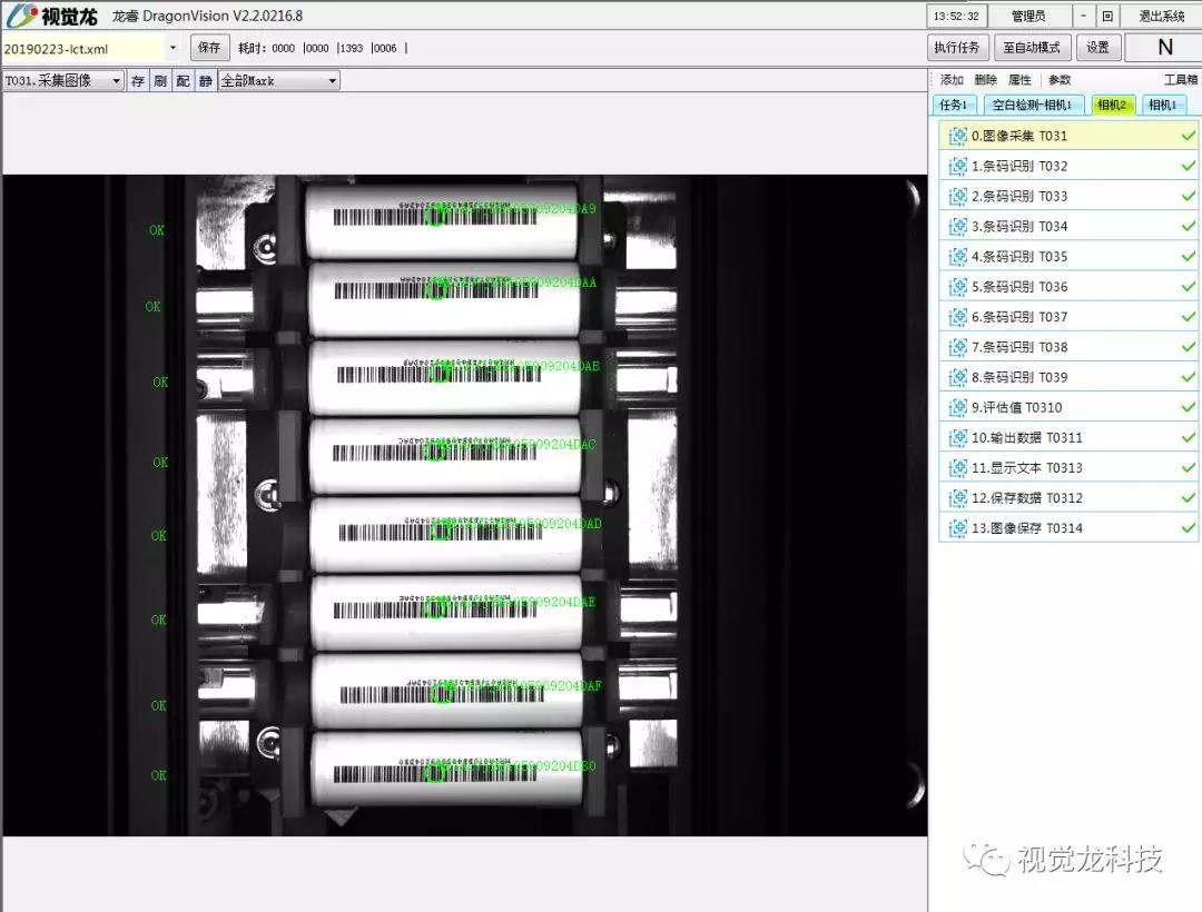 對(duì)每個(gè)電池上的既定區(qū)域利用龍睿中的斑塊識(shí)別及面積工具,若區(qū)域內(nèi)黑色斑塊面積為零或接近零→輸出ok信號(hào)機(jī)構(gòu)開(kāi)始噴碼;若斑塊面積大于規(guī)定值則NG開(kāi)啟電池旋轉(zhuǎn)轉(zhuǎn)后給到視覺(jué)觸發(fā)信號(hào),再繼續(xù)利用同一原理,直到全部8個(gè)電池都為ok信號(hào)后,再更換接下來(lái)8個(gè)電池。
